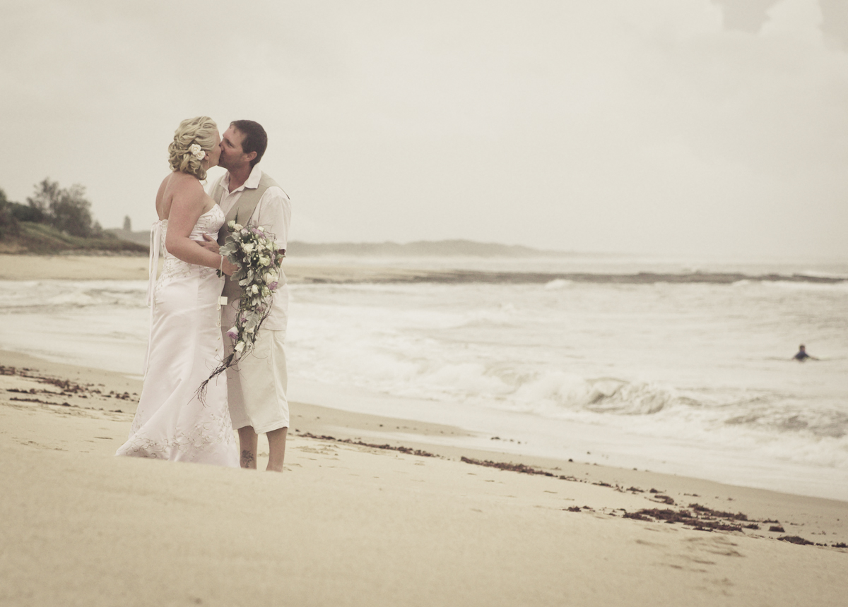This lovely couple's wedding day was about as wet as they come, so things didn't go quite as planned. Celebrant Michele Collins came to the rescue and conducted the touching ceremony at her beautiful house, and we did make it down to the beach for some photos in between showers, much to Maddy the dog's delight!